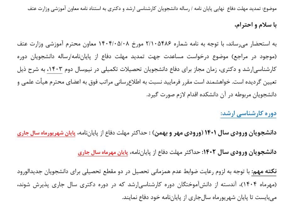 تمديد مهلت دفاع نهايي پايان نامه دانشجويان كارشناسي ارشد به استناد نامه معاون آموزشي وزارت عتف
